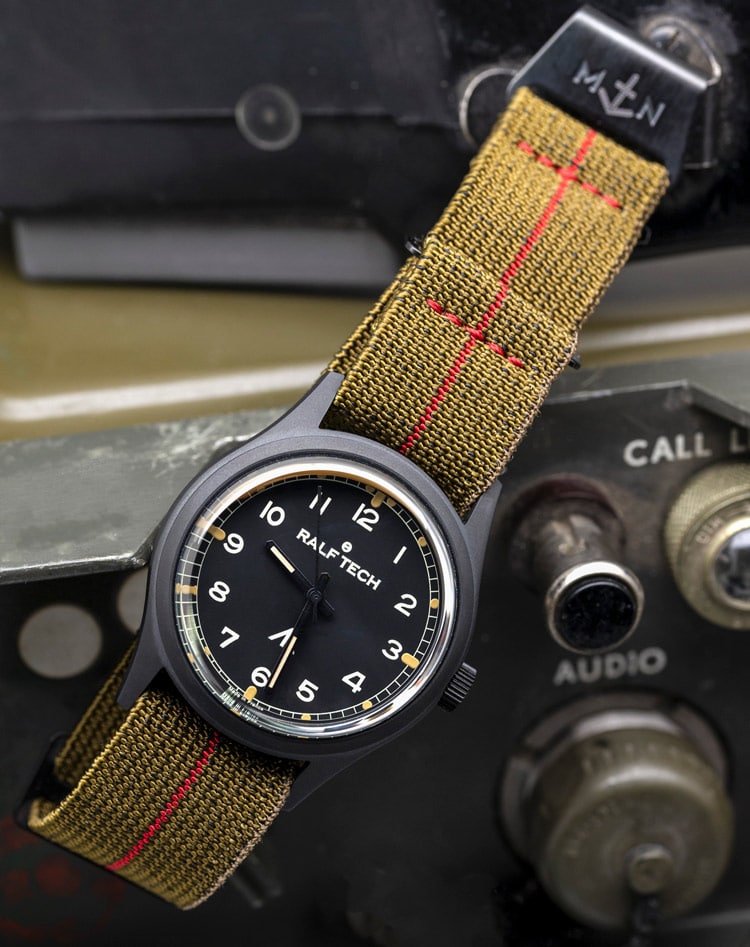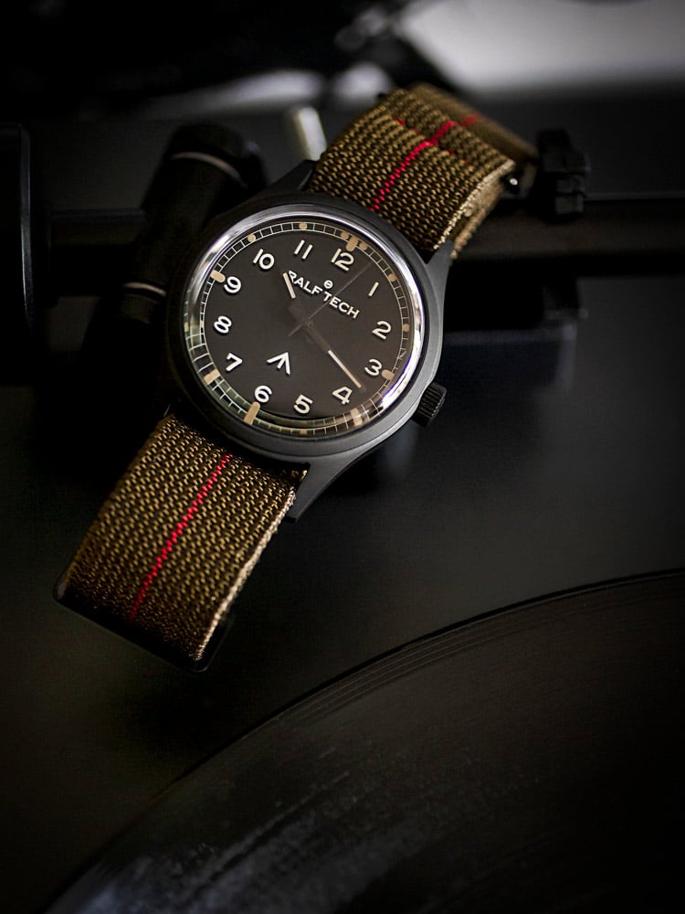 ACADÉMIE est la plus classique des RALF TECH. Cette version célèbre les Vétérans de toutes les guerres et en particulier ceux de la seconde Guerre Mondiale à travers son cadran inspiré de ceux ornant les montres des pilotes de la RAF. Ici en version noire mate pour plus de discrétion.