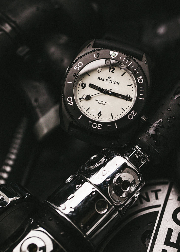 La WRV a été dessinée en 2012. Sa forme, très inspirée des plongeuses des années 70 mélange les codes esthétiques de cette période avec les contraintes d’une montre opérationnelle. Elle s’adapte ainsi à toutes les situations sans renier ses origines… Dans cette nouvelle édition, la WRV est équipée d’un mouvement Electric inédit et d’un cadran type sandwich. Les versions full black allient boitier noir mat et lunette ceramfine(r) noire mat. Cette déclinaison, tout à fait nouvelle chez RALF TECH s’inspire de la couleur de l’écume de mer.